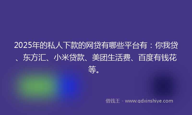 2025年的私人下款的网贷有哪些平台有:你我贷、东方汇、小米贷款、美团生活费、百度有钱花等。