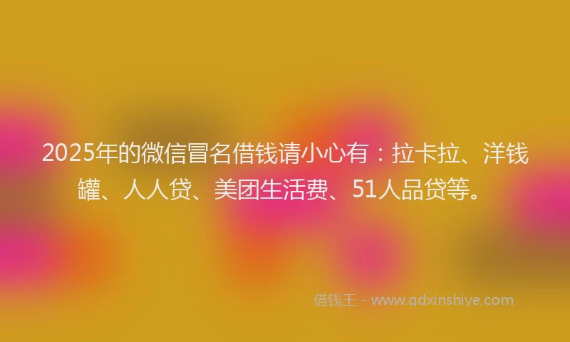 2025年的微信冒名借钱请小心有:拉卡拉、洋钱罐、人人贷、美团生活费、51人品贷等。