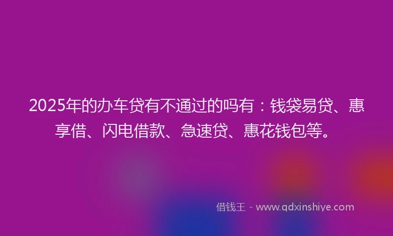 2025年的办车贷有不通过的吗有:钱袋易贷、惠享借、闪电借款、急速贷、惠花钱包等。