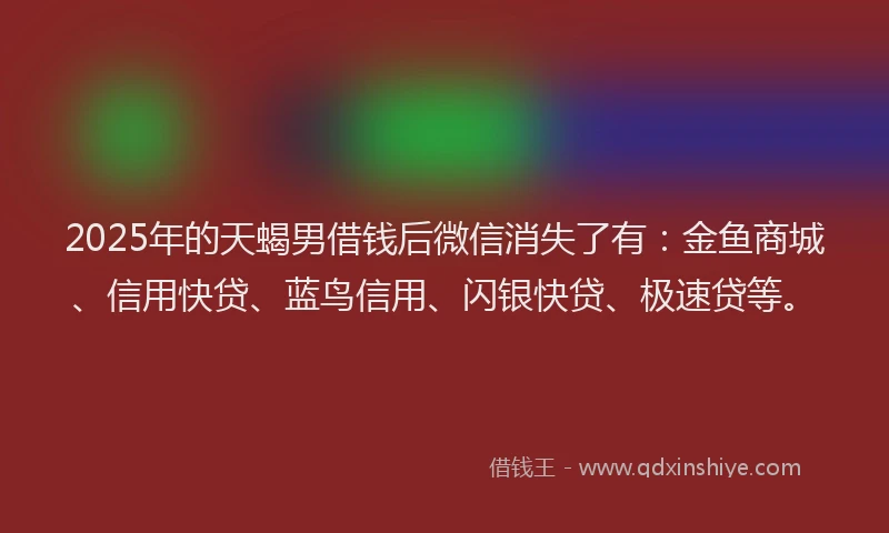 2025年的天蝎男借钱后微信消失了有:金鱼商城、信用快贷、蓝鸟信用、闪银快贷、极速贷等。