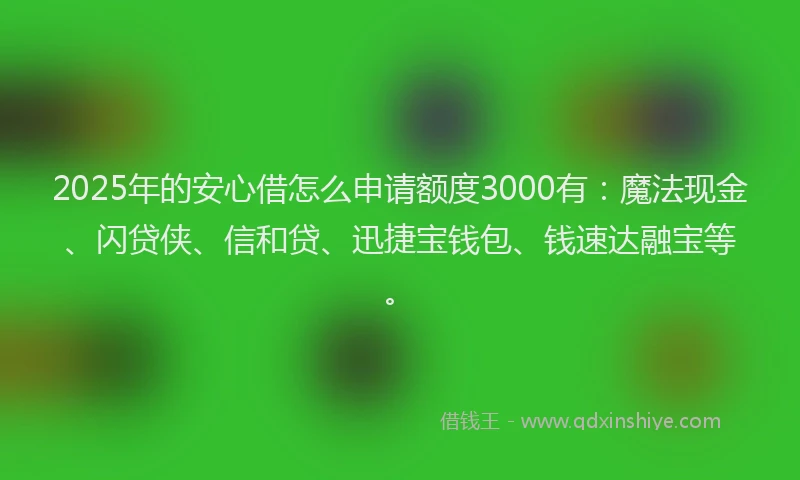 2025年的安心借怎么申请额度3000有:魔法现金、闪贷侠、信和贷、迅捷宝钱包、钱速达融宝等。