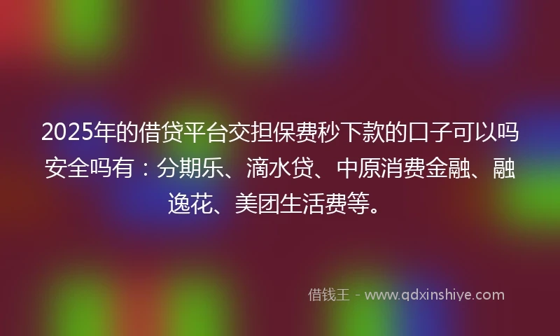 2025年的借贷平台交担保费秒下款的口子可以吗安全吗有:分期乐、滴水贷、中原消费金融、融逸花、美团生活费等。