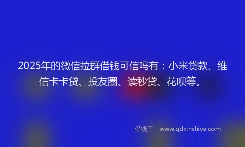 2025年的微信拉群借钱可信吗有:小米贷款、维信卡卡贷、投友圈、读秒贷、花呗等。
