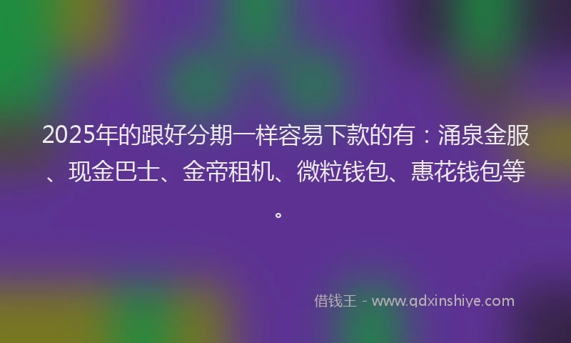 近年来,随着互联网的快速发展,贷款平台如雨后春笋般涌现,为广大用户提供了一条便捷的融资渠道,就让我来为大家详细介绍几款热门的跟好分期一样容易下款的,帮助大家更好地了解和选择适合自己的贷款服务,以下就是我要为大家推荐的五个跟好分期一样容易下款的。 2025年的跟好分期一样容易下款的有:涌泉金服、现金巴士、金帝租机、微粒钱包、惠花钱包等。 一、涌泉金服