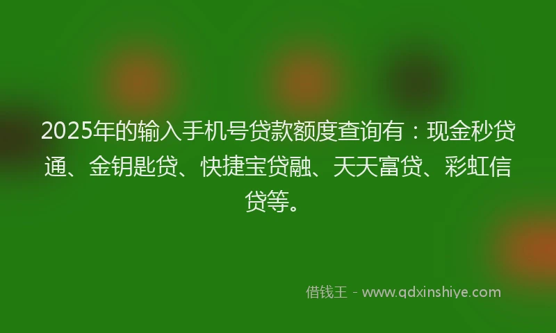 2025年的输入手机号贷款额度查询有:现金秒贷通、金钥匙贷、快捷宝贷融、天天富贷、彩虹信贷等。